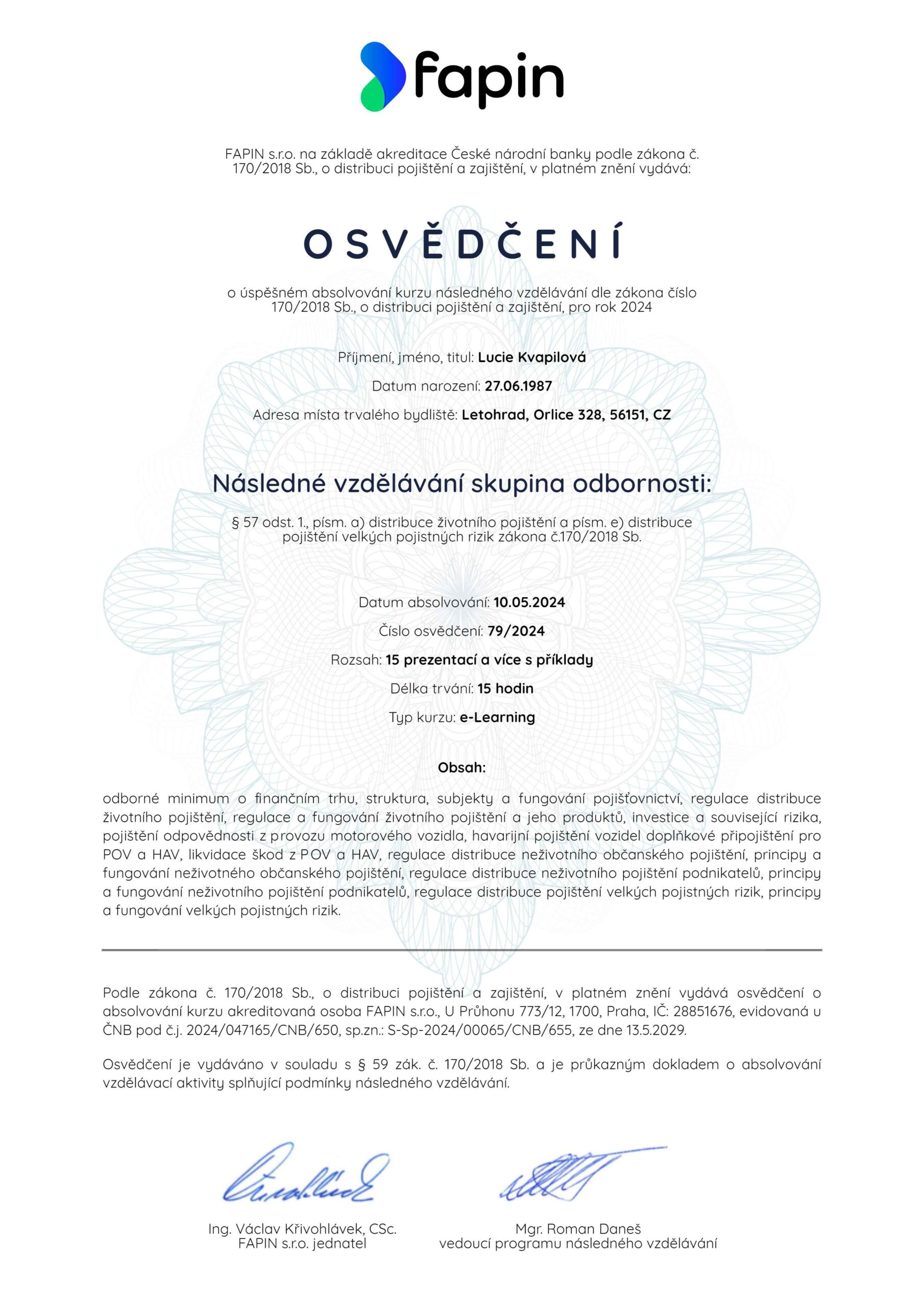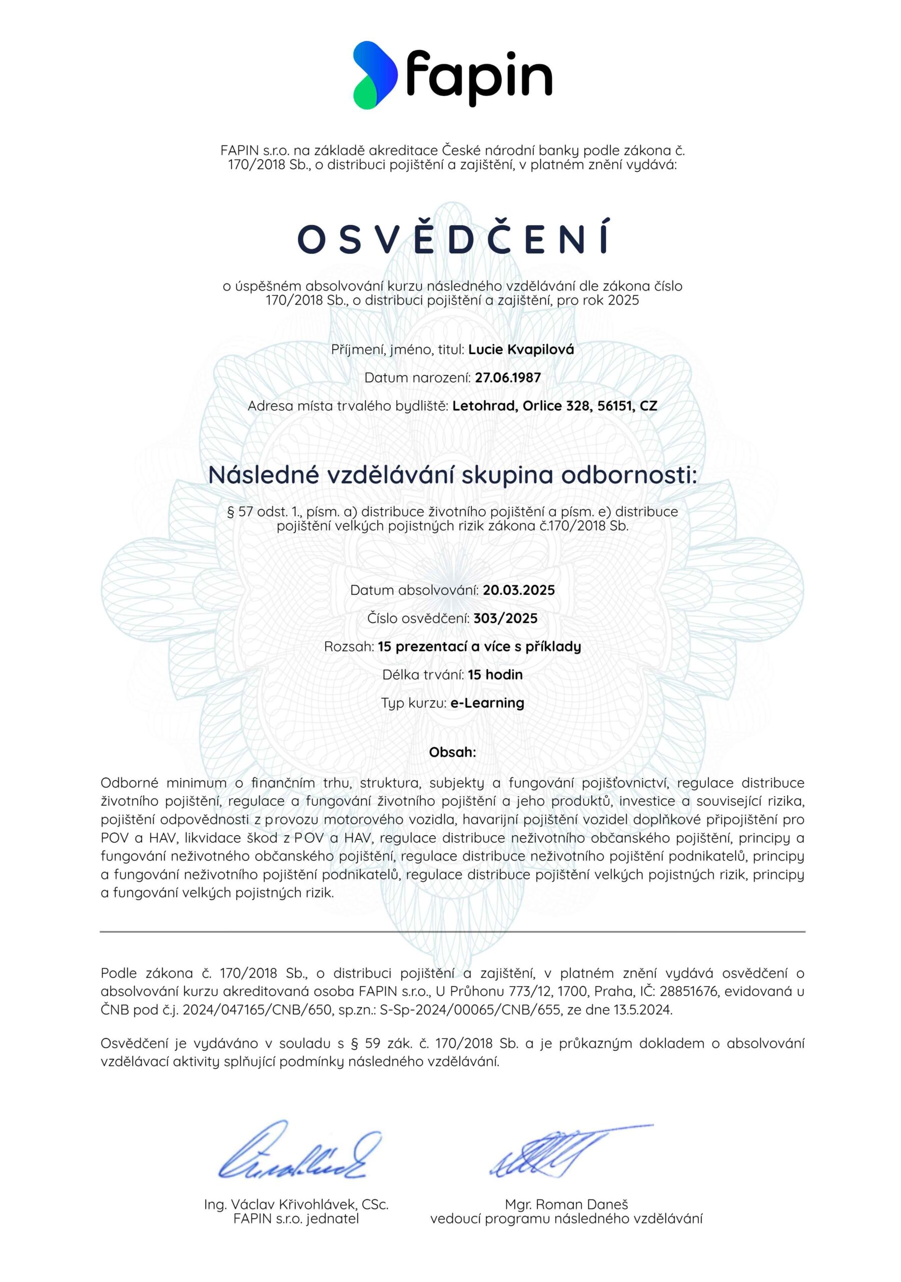 Svou činnost vykonávám podle živnostenského zákona, jako OSVČ, IČ:: 73989363, adresa provozovny: Orlice 328, Letohrad 56151, CZ. Investiční produkty, spotřebitelské úvěry, pojistné produkty a penzijní produkty zprostředkovávám jako vázaný zástupce registrovaný pod investičním zprostředkovatelem, samostatným zprostředkovatelem spotřebitelských úvěrů, samostatným zprostředkovatelem dle zákona o distribuci pojištění a zajištění a samostatným zprostředkovatelem dle zákona o doplňkovém penzijním spoření OK KLIENT a.s., IČO: 291 85 114, zapsaným v OR Krajského soudu v Brně, oddíl B, vložka 5944 (www.okklient.cz). Splňuji taktéž podmínky odborné způsobilosti a důvěryhodnosti dle účinné právní úpravy. Vázaný zástupce dle zákona č. 256/2004 Sb. a č. 170/2018 Spotřebitelské úvěry dle zákona č. 257/2016 Sb. Účetnictví dle ŽL oprávnění z roku 2015